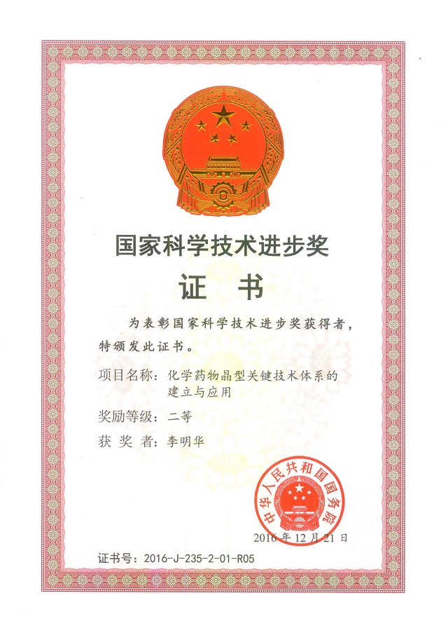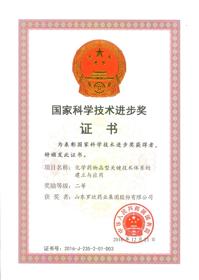 2017年1月9日,國家科學技術獎勵大會在北京人民大會堂隆重舉行。由中國醫(yī)學科學院藥物研究所、山東羅欣藥業(yè)集團股份有限公司等單位聯(lián)合完成的“化學藥物晶型關鍵技術體系的建立與應用”項目榮獲國家科技進步獎二等獎。本項目實現(xiàn)了山東羅欣藥業(yè)在國家科技獎上的重大突破。