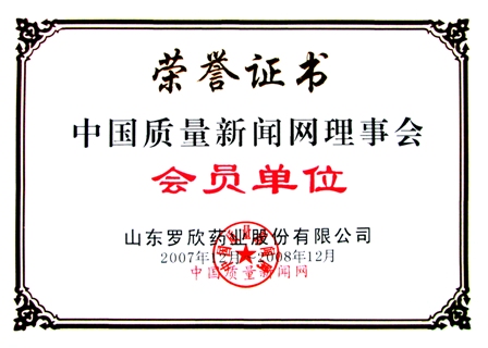 2007年12月,山東羅欣藥業(yè)股份有限公司再度榮獲由中國(guó)質(zhì)量新聞網(wǎng)頒發(fā)的“中國(guó)質(zhì)量新聞網(wǎng)理事會(huì)會(huì)員單位”榮譽(yù)證書。